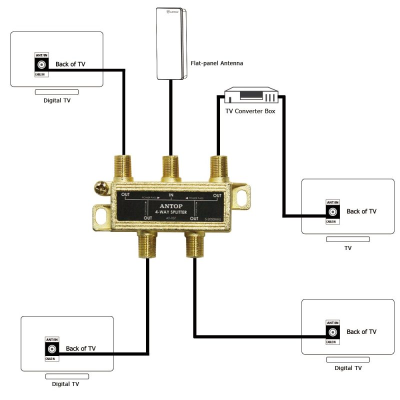 The Antop 4-ways Splitter AT-707 splits a single incoming coaxial signal, such as satellite signal, over-the-air HD (digital TV) antenna signal, into four outgoing signals.