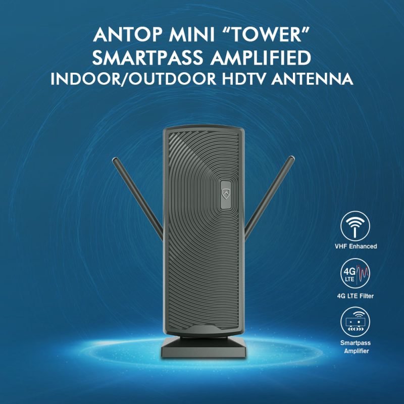 Antop AT-405BV “Mini Tower” Flat-Panel Smartpass Amplified Indoor/Outdoor HDTV Antenna, Dark Grey