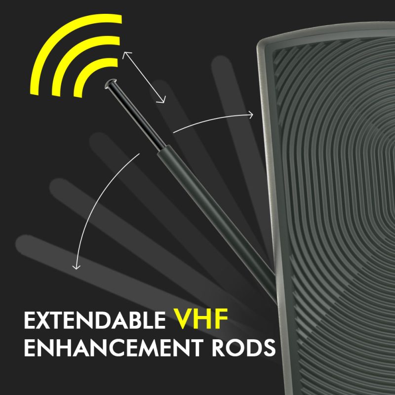 Engineered with new extendable VHF rods to enhance signal frequency range.