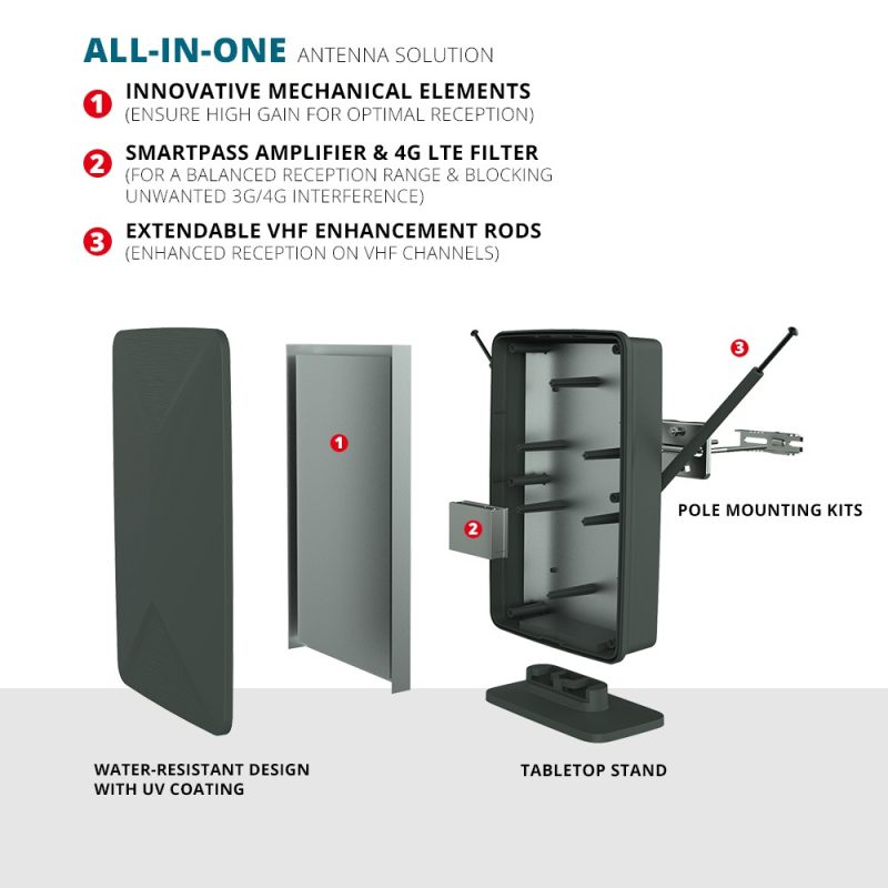 · Extendable VHF Enhancer Rods to strengthen VHF reception