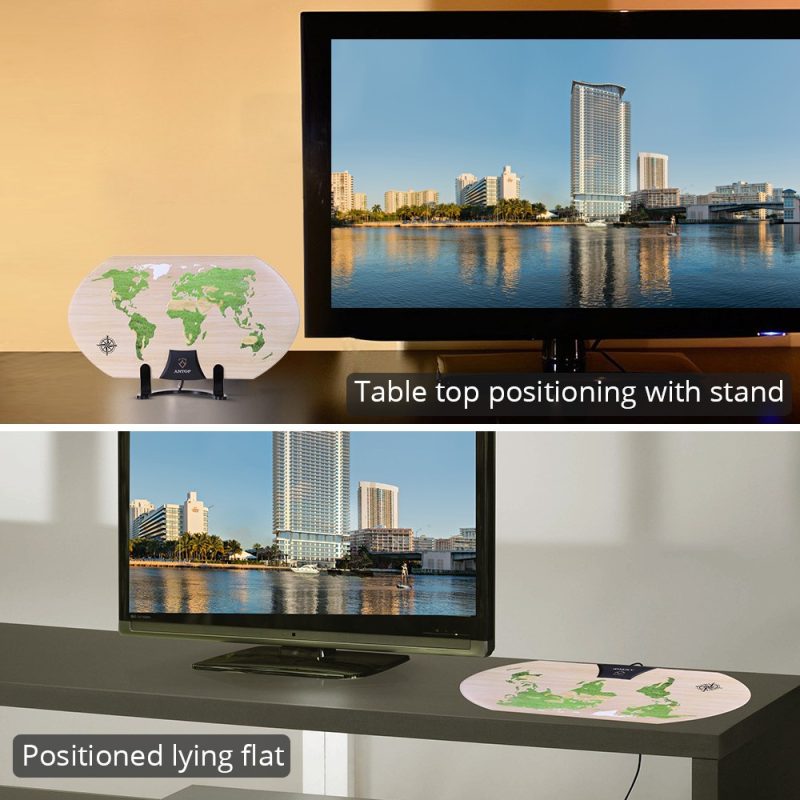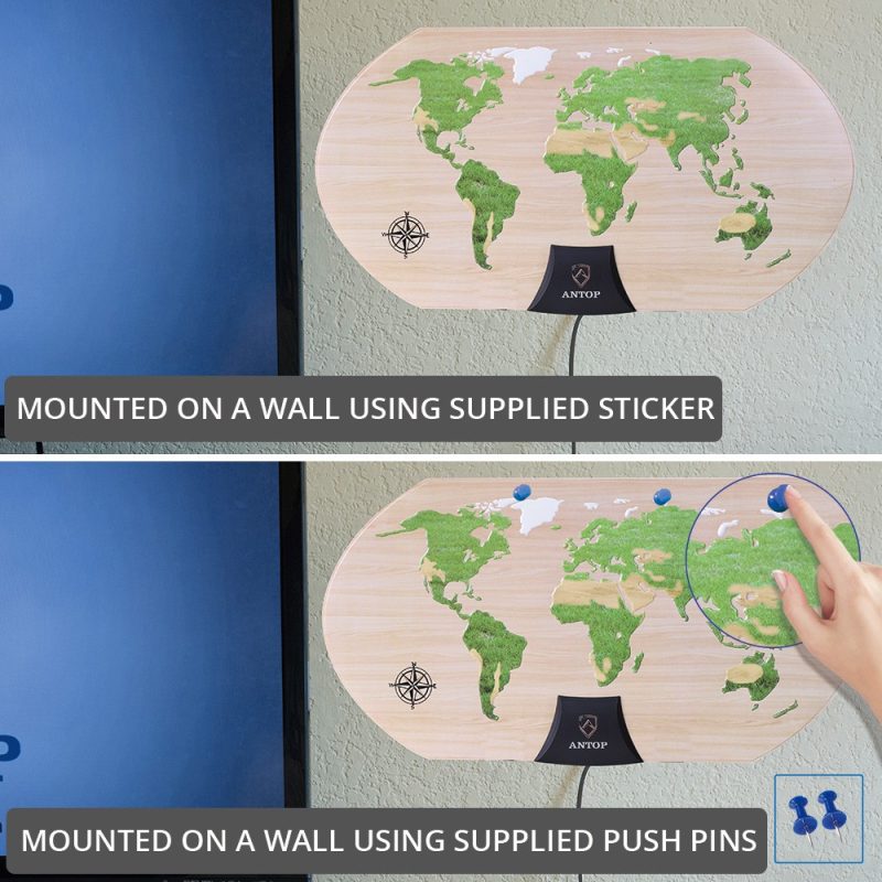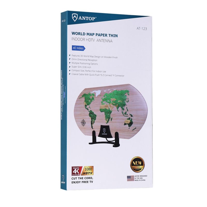 Antop Paper Thin Indoor HDTV Antenna, unique 3d World Map design imprint with light oak wood finish, is aesthetically pleasing and suitable to match a wide range of home interior styles. The Omni-directional reception pattern and multiple installation options allow you to install your antenna in various locations around your home and still pick up clear signals. With the Antop World Map AT-123, there is no monthly fee or subscription. Just plug into a TV, scan the channels, and then enjoy your local TV shows!