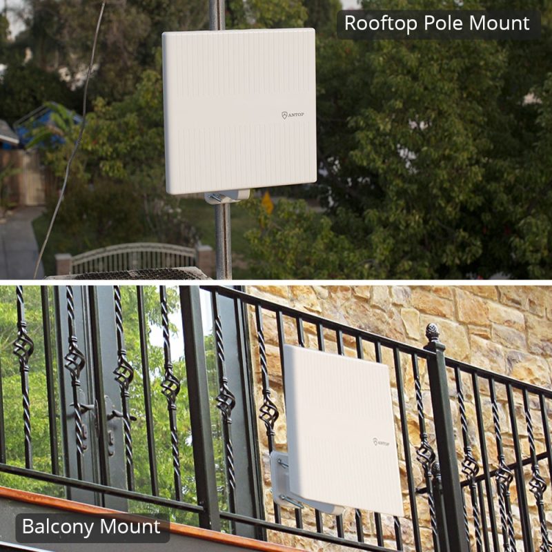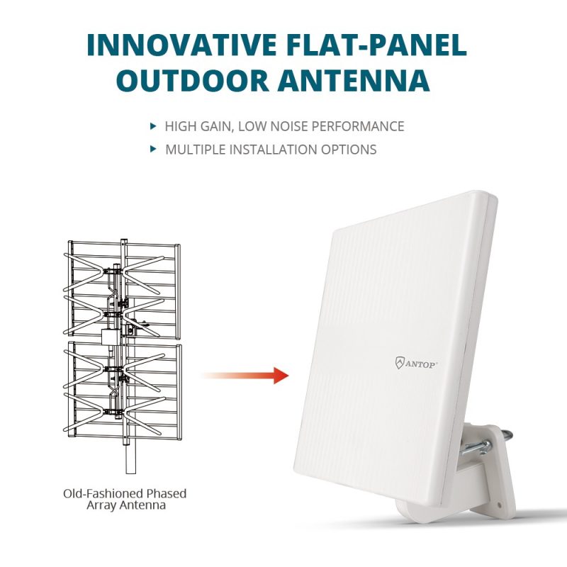 The Antop Flat-Panel AT-413 slim-panel design is aesthetically pleasing and suitable to match a wide range of home exterior styles. The Omnidirectional reception and UV coating and weather resistant finish, allows you to install your AT-413 antenna in various locations around the exterior of your home: wall, roof, balcony. It can even be installed in an roof top, or RV. The AT-413 supports HDTV, 1080P TV and 4K ULTRA HD and is compatible with TV converter boxes or digital TVs.