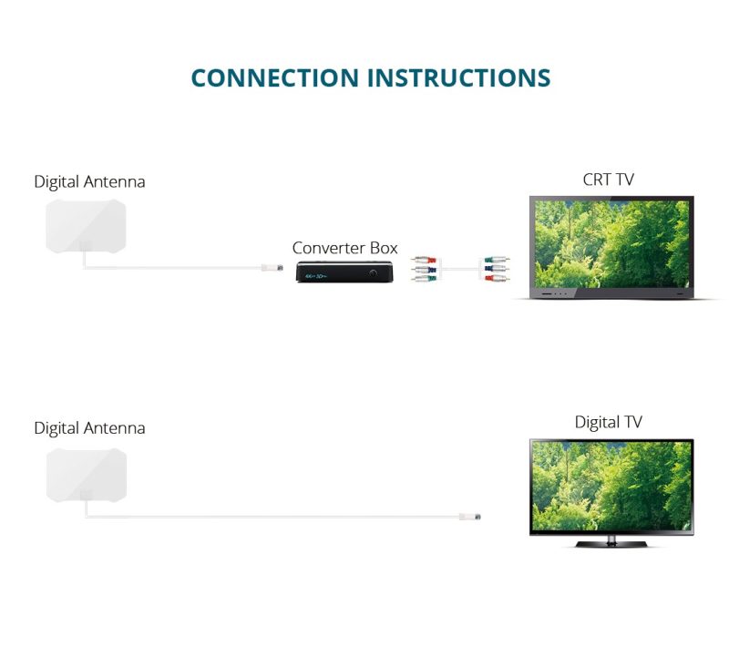 NOTE: Antenna effectiveness is influenced by the distance from signal origination point, station signal strength level, building construction, antenna positioning, reflections from nearby structures and any power consumption sources. The amount of free over-the-air channels you can receive will vary by area and antenna selection, check signal availability at Antop Signalmaps.