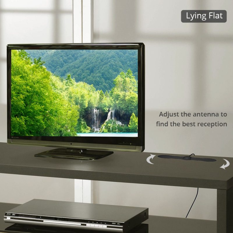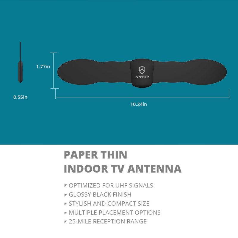 The ANTOP Paper Thin Indoor HDTV Antenna, AT-140 features a super slim design (less than an inch thick, 0.55’’), is aesthetically pleasing and suitable to match a wide range of home décor styles. Its compact size allows you to position the antenna almost anywhere in your home. The AT-140 supports HDTV, 1080P TV and 4K ULTRA HD, and is compatible with TV converter boxes or digital TVs.