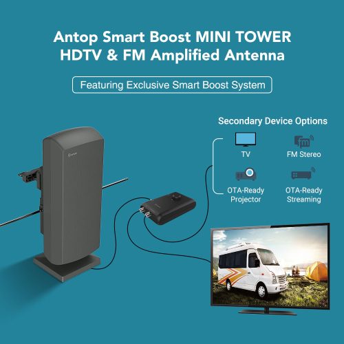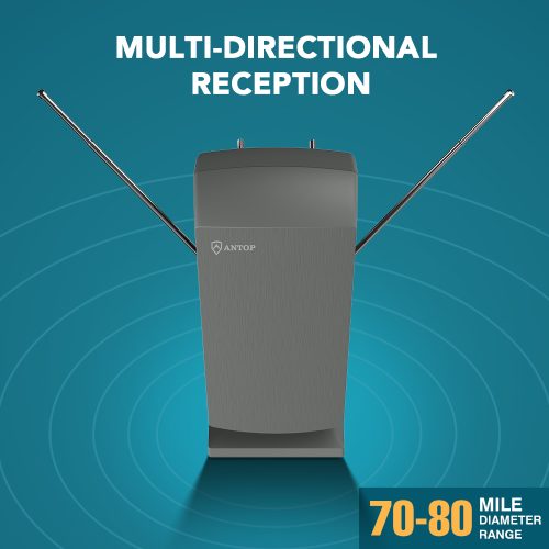 The Antop – SBS-805 HDTV & FM Amplified Antenna puts free over-the-air HDTV viewing within your reach. Receive popular channels like ABC, CBS, NBC, PBS, Fox, Univision and others from up to 80 miles away. Its Smart Boost System delivers the correct balance between short-, mid- and long-range signals to give you plenty of viewing options.