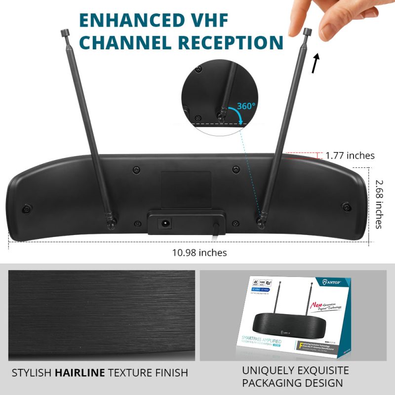 The Antop Bow-style AT-217B sleek design in Hairline black, is aesthetically pleasing and can match a wide range of home décor styles. Its compact size allows you to position the antenna anywhere in your home. The AT-217B supports HDTV, 1080P TV and 4K ULTRA HD and is compatible with TV converter boxes and digital TVs.