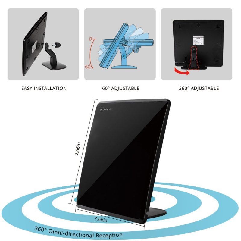 The Antop Flat-Panel AT-207B designed in Piano Black is aesthetically pleasing and suitable to match a wide range of home décor styles. Its compact size allows you to position the antenna anywhere in your home. The AT-207B supports HDTV, 1080P TV and 4K ULTRA HD and is compatible with TV converter boxes or digital TVs.