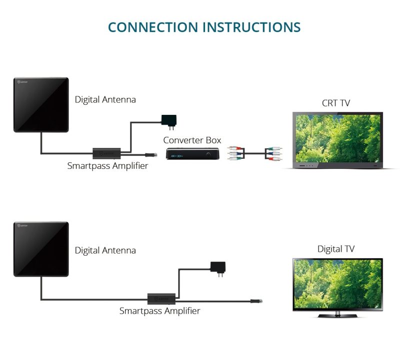 The Smartpass Amplifier’s all-in-one design allows easier connection, delivers correct balance between short and long range reception. It must be powered in order to function. Push the smart switch On or Off and select the switching with which more channels are received.