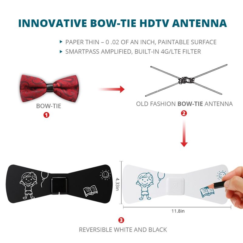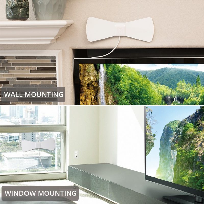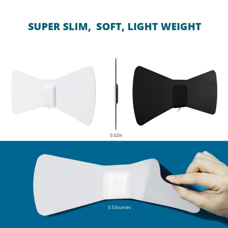 The Antop Paper Thin Indoor HDTV Antenna, AT-105B super slim and Reversible White and Black design (less than an inch thick, 0.02’) is aesthetically pleasing and suitable to match a wide range of home décor styles. Its compact size allows you to position the antenna anywhere in your home. The AT-105B supports HDTV, 1080P TV and 4K ULTRA HD and is compatible with TV converter boxes or digital TVs.