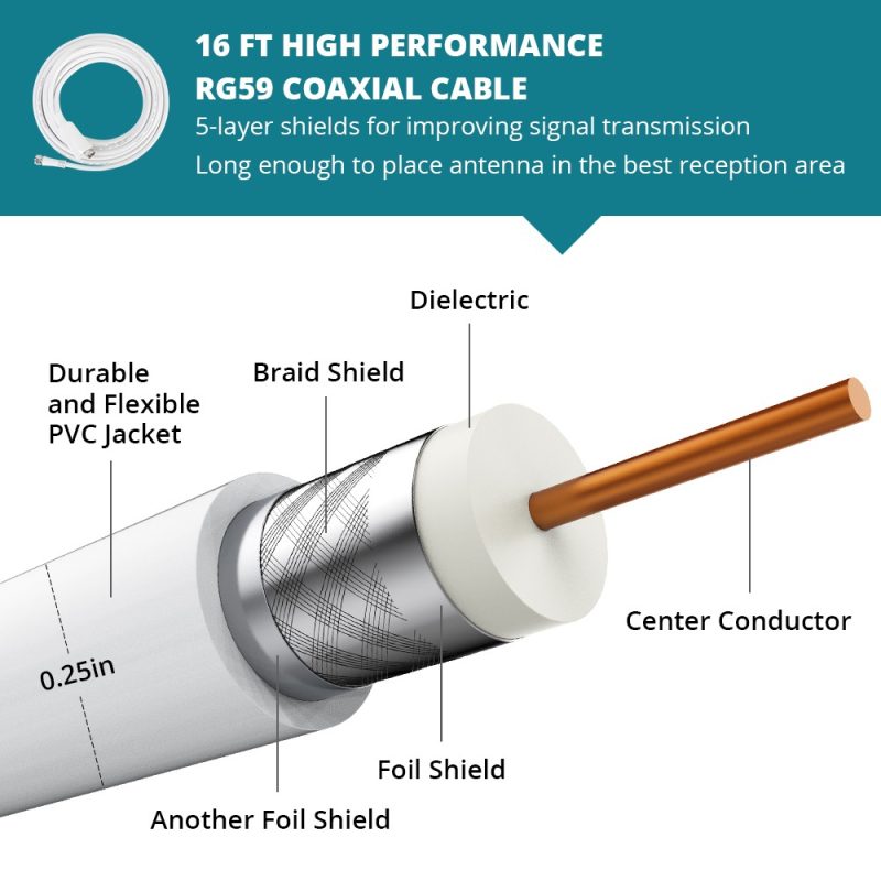 The included cable has a nice weather sleeve but unfortunately it is only 16’ long and if you want to install it on a two story home you will need a longer cable, I used a 25’ cable and it was barely enough. I fed the antenna to the existing installed coax wire in the house and I drive 7 TV sets, some behind 2 splitters with no major problems. The set closer to the antenna get 62 stations and the ones farther away 50+ station. I suspect that replacing the main splitter with an amplified one would increase reception on all the sets connected to it.