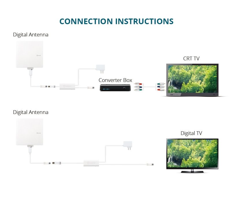 NOTE: Antenna effectiveness is influenced by the distance from signal origination point, station signal strength level, building construction, antenna positioning, reflections from nearby structures and any power consumption sources. The amount of free over-the-air channels you can receive will vary by area and antenna selection, check signal availability at Antop Signalmaps.