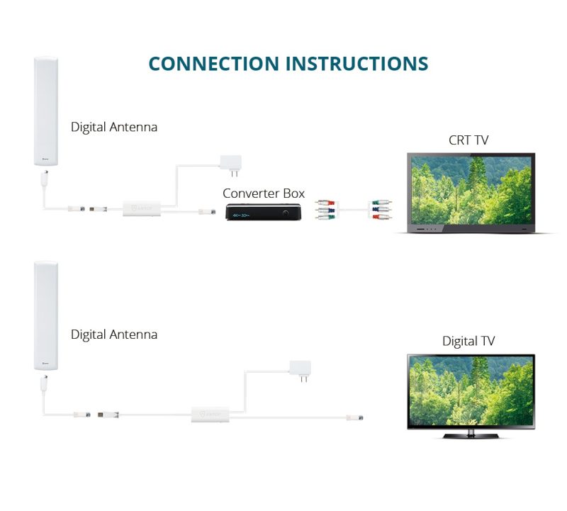 NOTE: Antenna effectiveness is influenced by the distance from signal origination point, station signal strength level, building construction, antenna positioning, reflections from nearby structures and any power consumption sources. The amount of free over-the-air channels you can receive will vary by area and antenna selection, check signal availability at Antop Signalmaps.